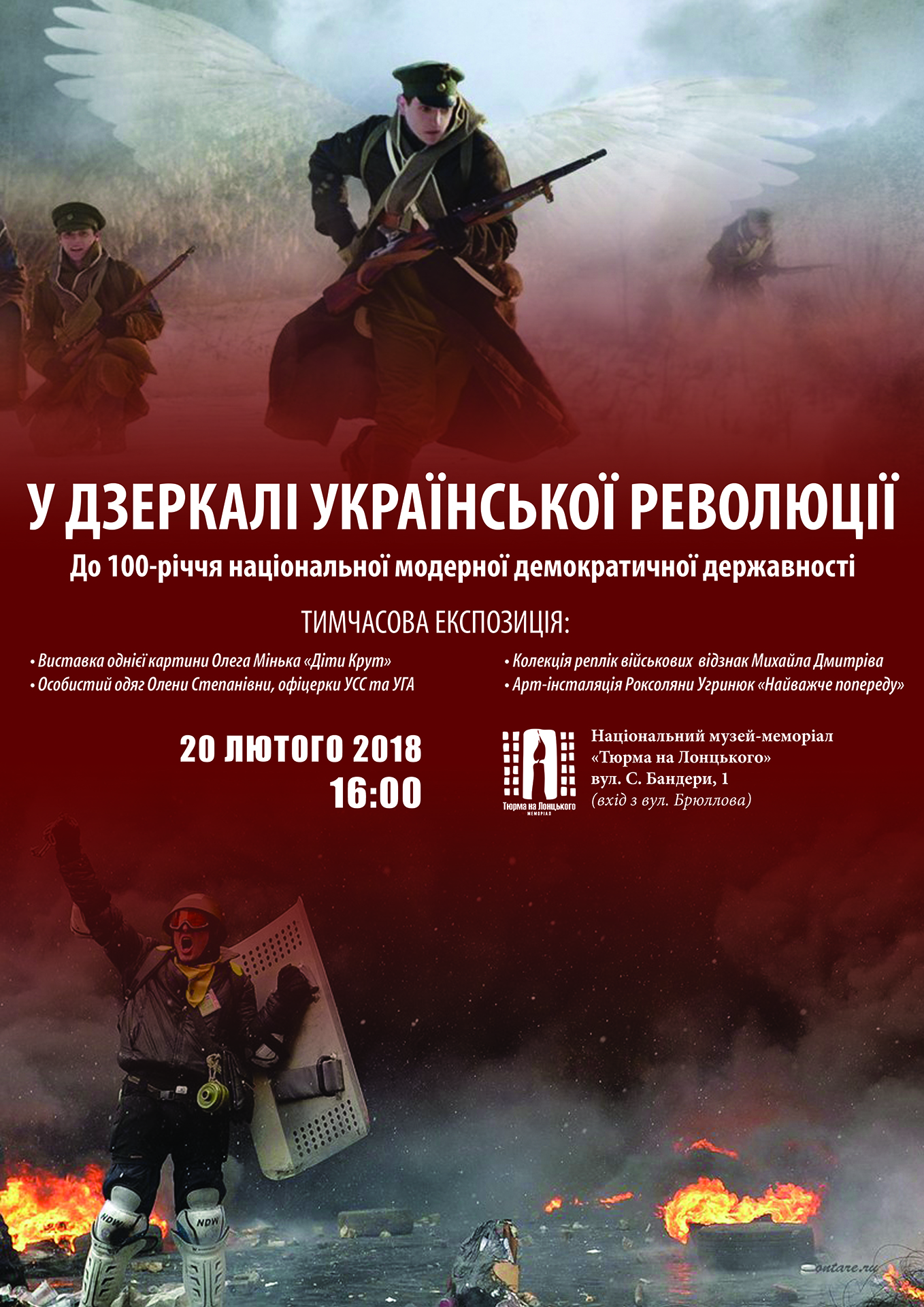 20 лютого о 16:00 чекаємо вас у Національному музеї-меморіалі “Тюрма на Лонцького” на відкритті виставки “У дзеркалі української революції” До 100-річчя національноїмодерної демократичної державності Тимчасова експозиція: Виставка однієї картини Олега Мінька «Діти Крут»Колекція реплік військових відзнак Михайла ДмитріваОсобистий одяг Олени Степанівни, офіцерки УСС та УГААрт-інсталяція Роксоляни Угринюк «Найважче попереду»