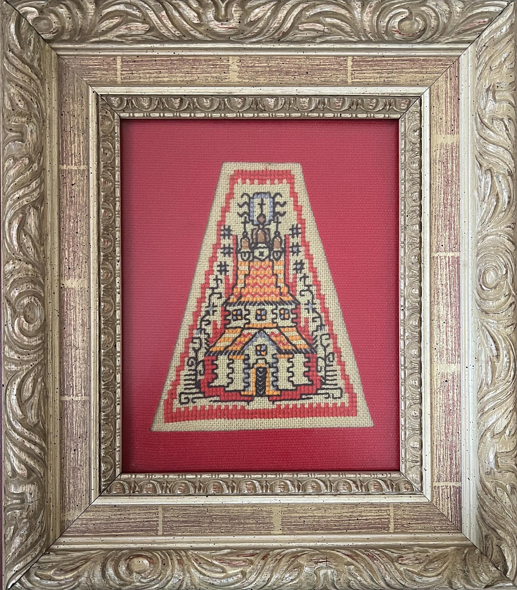 Вишивка виконана у червоному, помаранчевому, голубому та коричневому кольорах. Оформлена у трапецеподібній формі червоним паспарту із текстилю, різьблену дерев’яну раму, під склом.