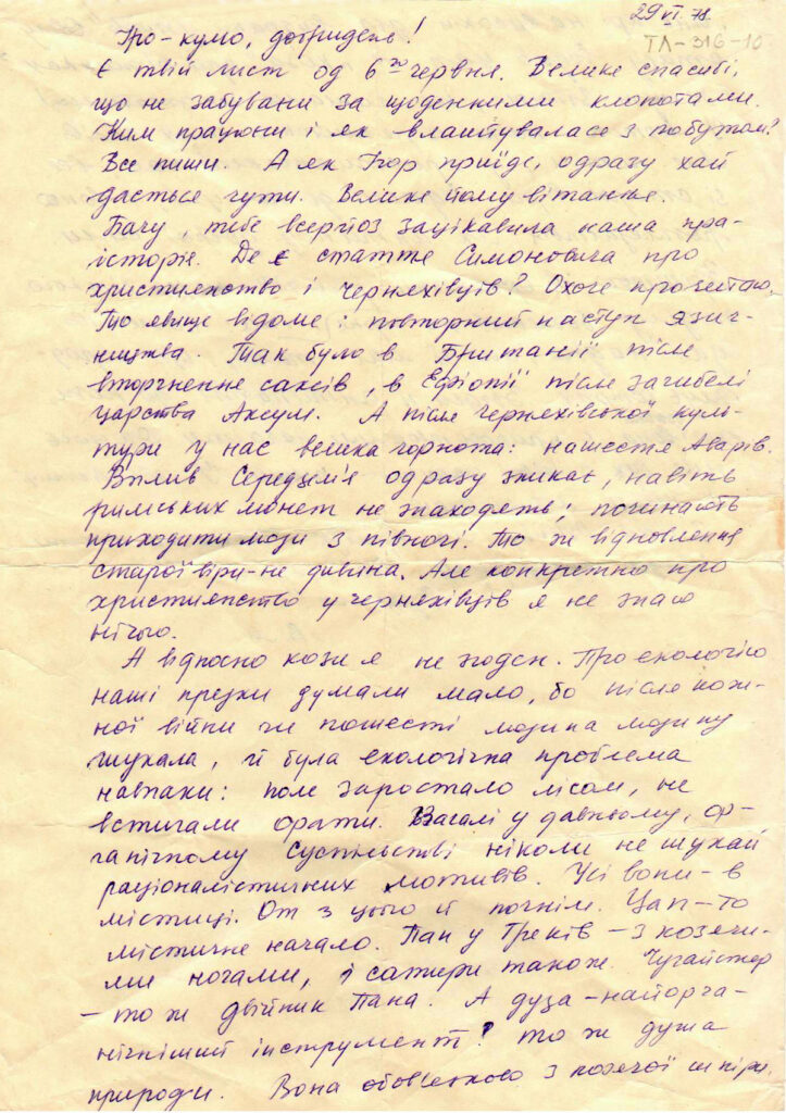 Чекаю ще віршів із «Голосу трави». Почитав би також Ігореві речі нові. А з старих хочу «Золотий тік». «Середні віки на Україні» я одержав, а з нею «Грошовий обіг…» Котляра.
