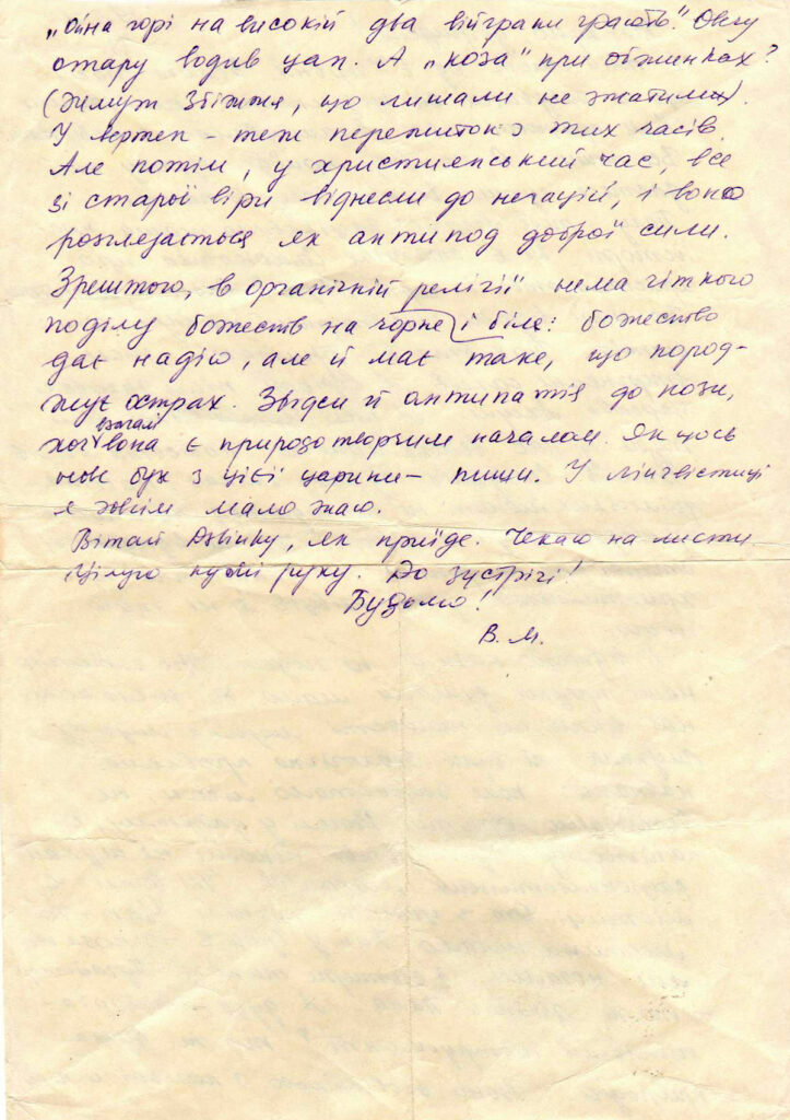 Факт – нецікаво; те, що за фактом – от що цікаво. Прочитай (а може читала?) «Соловейко-Сольвейг» Драча у №4 «Вітчизни». І хотілося б твоє враження знати. Не пишеш про побут: як влаштувалося і подібне. Доки зайде лист, Ігор уже, мабуть, буде на Волі. Дуже, дуже велике йому вітання. І Дзвінку вітай. Чи хто уже був у тебе? Буду кінчати. Чекаю на листи. Ех, «коли ми зійдемося знову?», як казав Тарас. Цілую кумі руку і зичу всього найкращого. До зустрічі! Будьмо!»