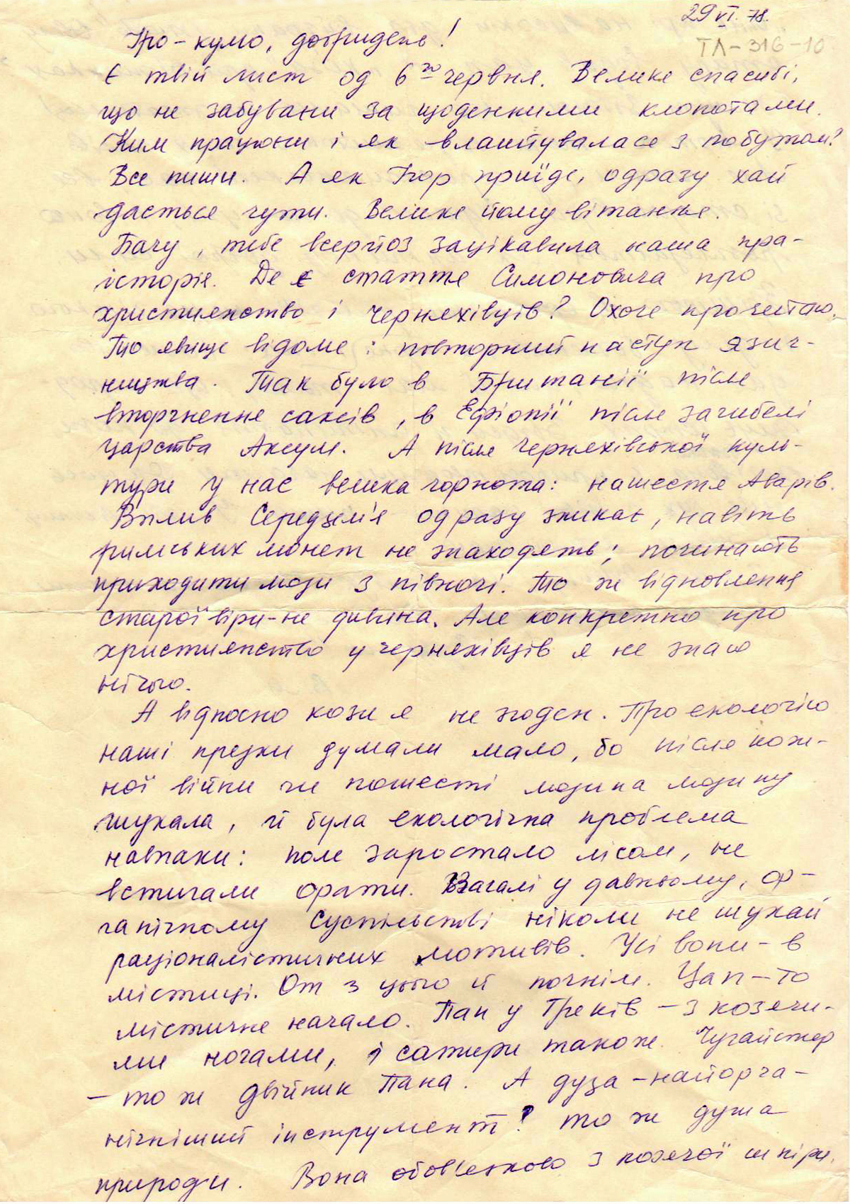 Бачу, тебе всерйоз зацікавила наша праісторія. Де є стаття Симоновича про християнство і черняхівців? Охоче прочитаю. То явище відоме: повторний наступ язичництва. Так було в Британії після вторгнення саксів, в Ефіопії після загибелі царства Аксум. А після черняхівської культури у нас велика чорнота: нашестя аварів.