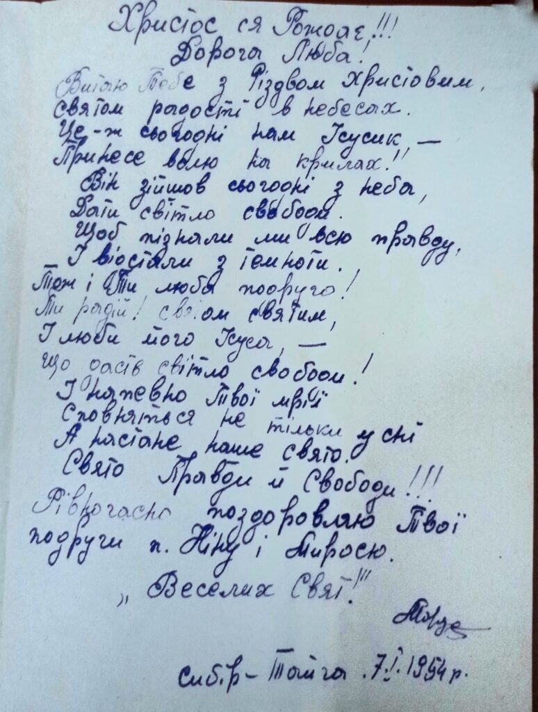 Саме ці імена збереглися на саморобній листівці, якою Маруся привітала Любу далекого 1954 року 7 січня на Різдво.