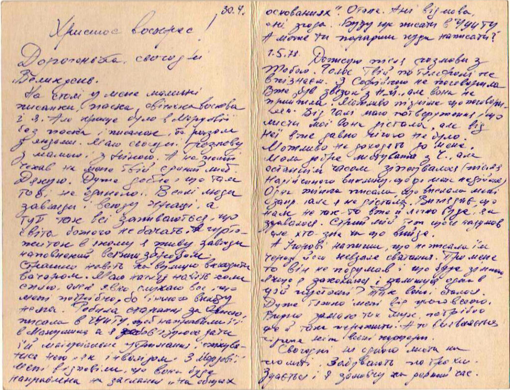 Дописую після розмови з Тобою. Голос Твій по телефоні не впізнаєш. З Софійкою не поговорила. Вже був зв’язок з Н[ью]-Й[орка], але вона не прийшла. Можливо, пізніше ще поговоримо. Від Галі маю потвердження, що листи мої вона дістала, але від неї вже давно нічого не було. Можливо, не доходять до мене. Мала добре листування з Ч., але останнім часом зіпсувалося (після Надійчиного виклику, що до мене не дійшов). Одна жінка писала, що вислала мені запр. [ошення], але я не дістала. Виглядає, що нам не так-то вже й легко буде, як здавалося. Стрий мій теж щось надумав, але хтозна чи що вийде.