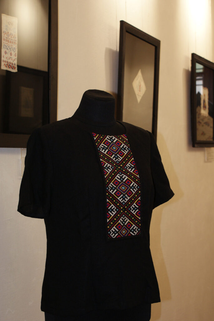 Чорна полотняна блузка сучасного крою, оздоблена старовинною вишивкою з Городоччини, з якої тягнеться коріння родини Стасівих. Ця блузка – подарунок від доньки, з’явилася в гардеробі Ірини Калинець уже в останні роки життя.