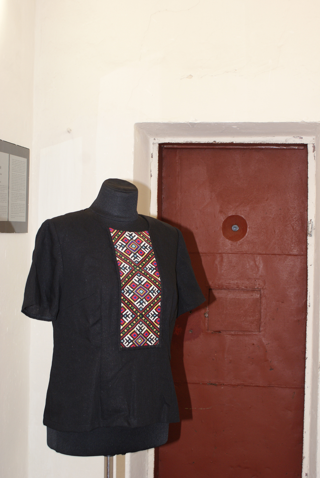 Чорна полотняна блузка сучасного крою, оздоблена старовинною вишивкою з Городоччини, з якої тягнеться коріння родини Стасівих. Ця блузка – подарунок від доньки, з’явилася в гардеробі Ірини Калинець уже в останні роки життя.